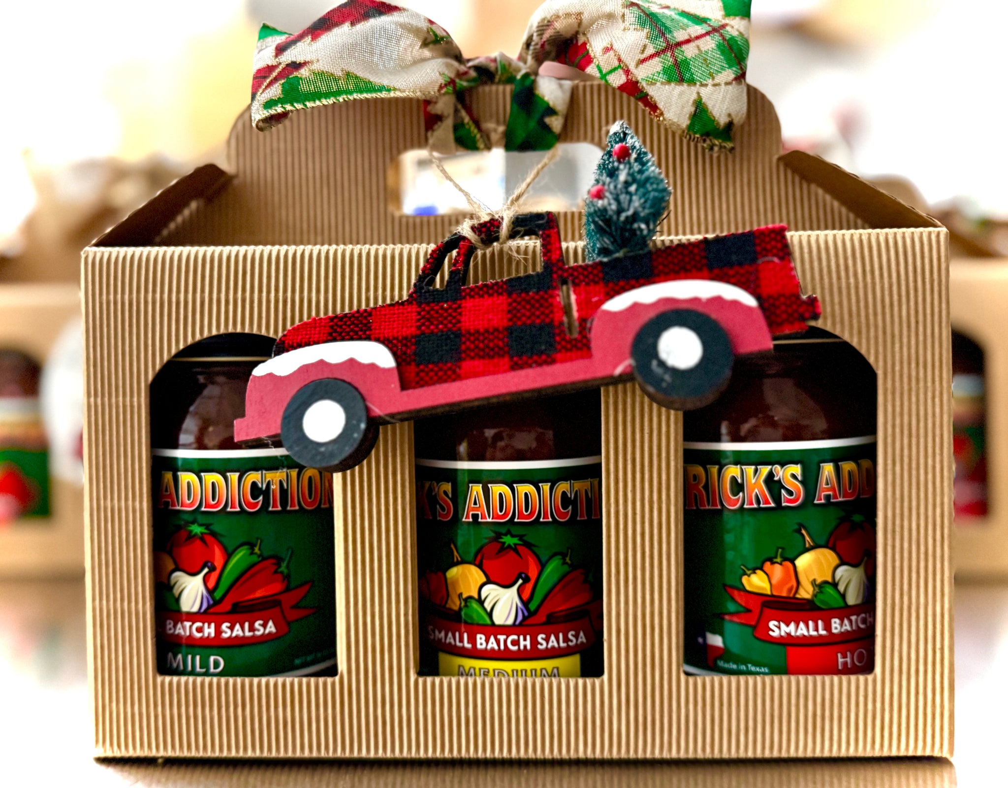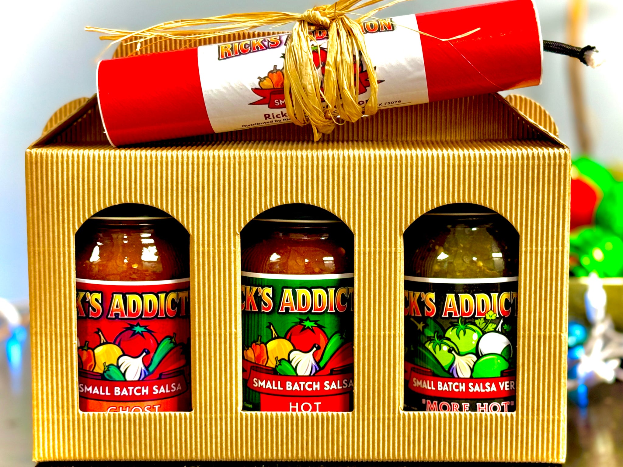 A great gift for friends and family to help get everyone into the holiday spirit! Send it straight to your loved ones. Special Holiday Gift Pack carrier box filled with delicious salsa to warm them on those wintry nights. Includes a dynamite stick of chili seasoning or a Christmas tree ornament - your choice! For the chili seasoning, just follow the recipe on the label. We will reach out to you via email upon placement of your order to specify which combination of salsa you want in your gift pack, as well as your preference for chili seasoning or ornament. Happy Snackin'!